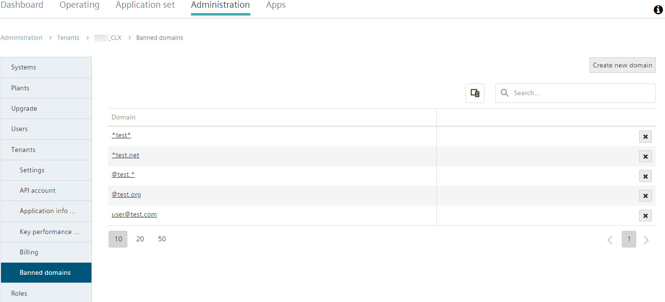 Unwanted user domains can be locked for a specific user. A negative list is set up in the corresponding tenant menu. Entries in the negative list prevent the registration of users using the locked domains.