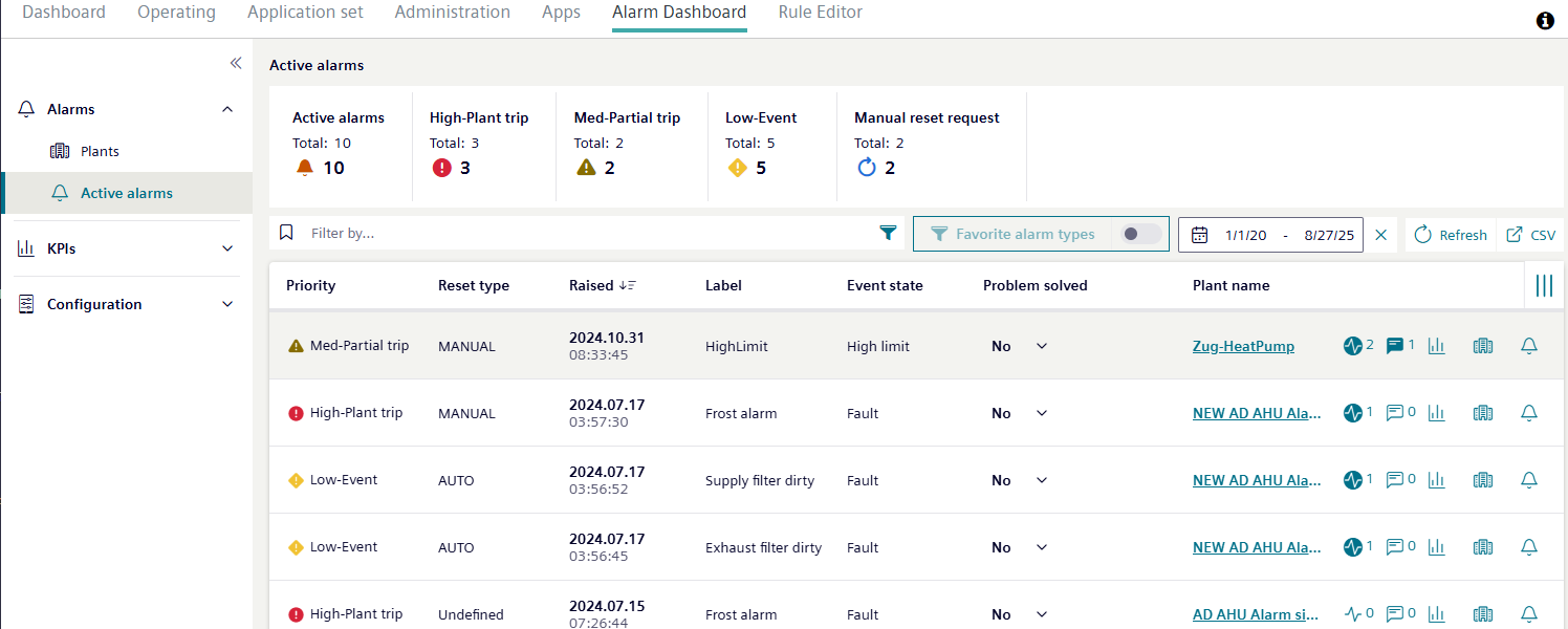 The Alarm Dashboard displays all recognized alarms that are active in the "Active alarms" view. Each alarm is displayed in a separate row. Alarms can be sorted and filtered. You can filter alarm types that are considered critical/relevant.