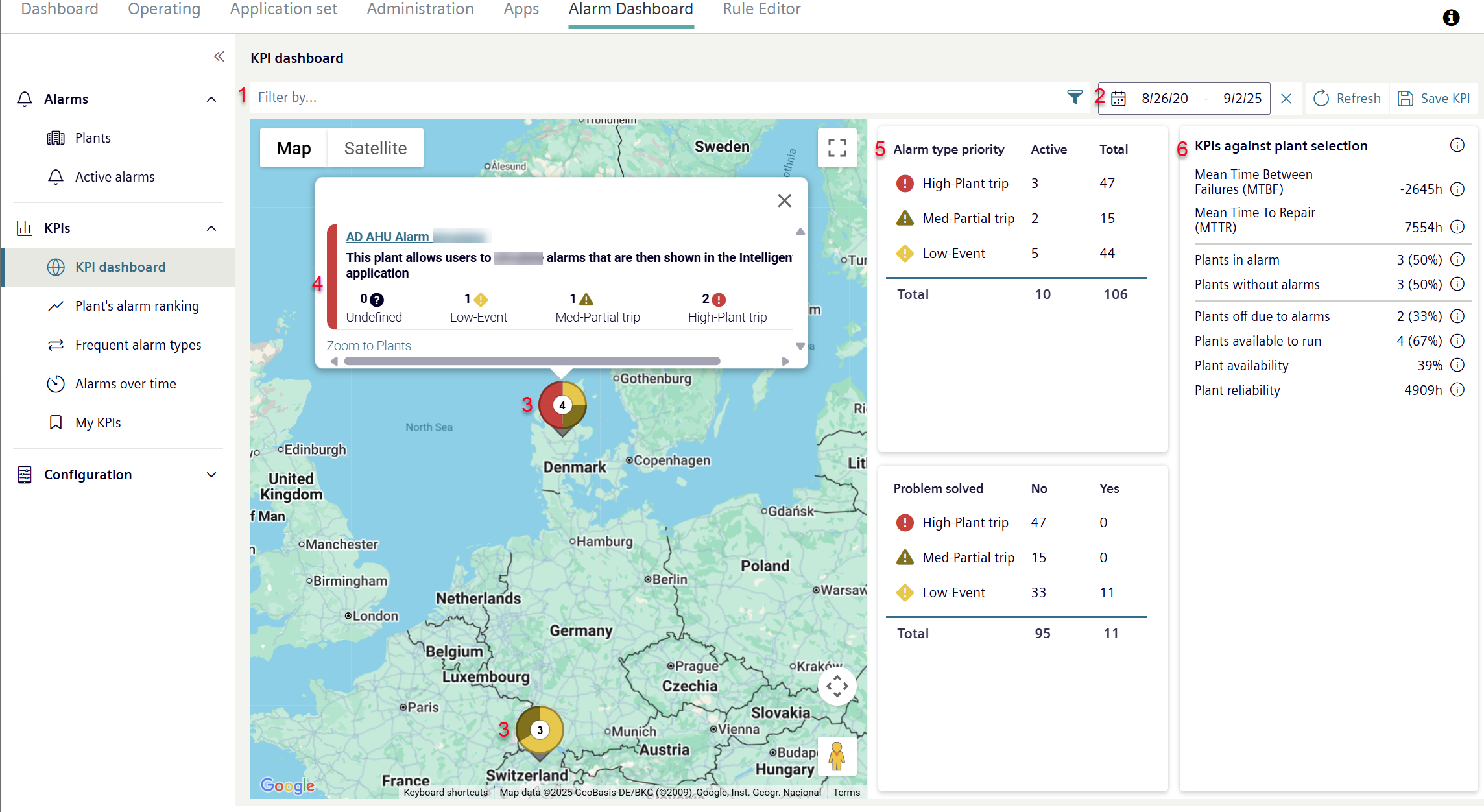 - A statistical evaluation of the selected alarms is displayed as KPIs (6).