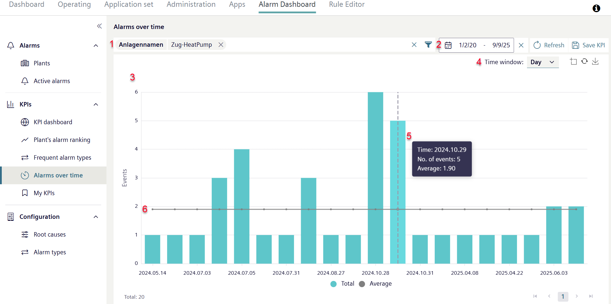 - The average number of alarms on the selected plants in selected time frame is displayed as a line (6).