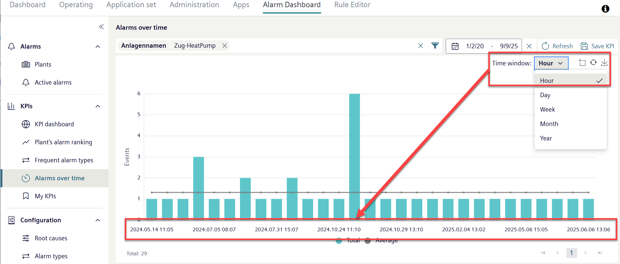 - Go to menu "Alarm Dashboard > KPIs > Alarms over time".